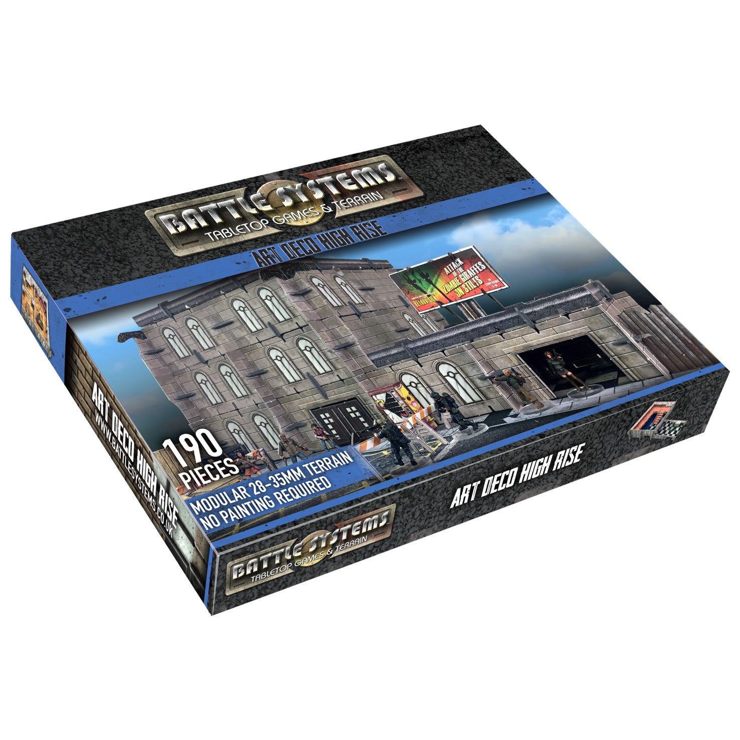 This pack contains everything you need to upgrade your urban gaming table with timeless art-deco stylings. It contains enough to construct a grandiose three-storey building or multiple smaller structures, including majestic multi-level interiors. The set is compatible with any of the Battle Systems Urban Core Sets.